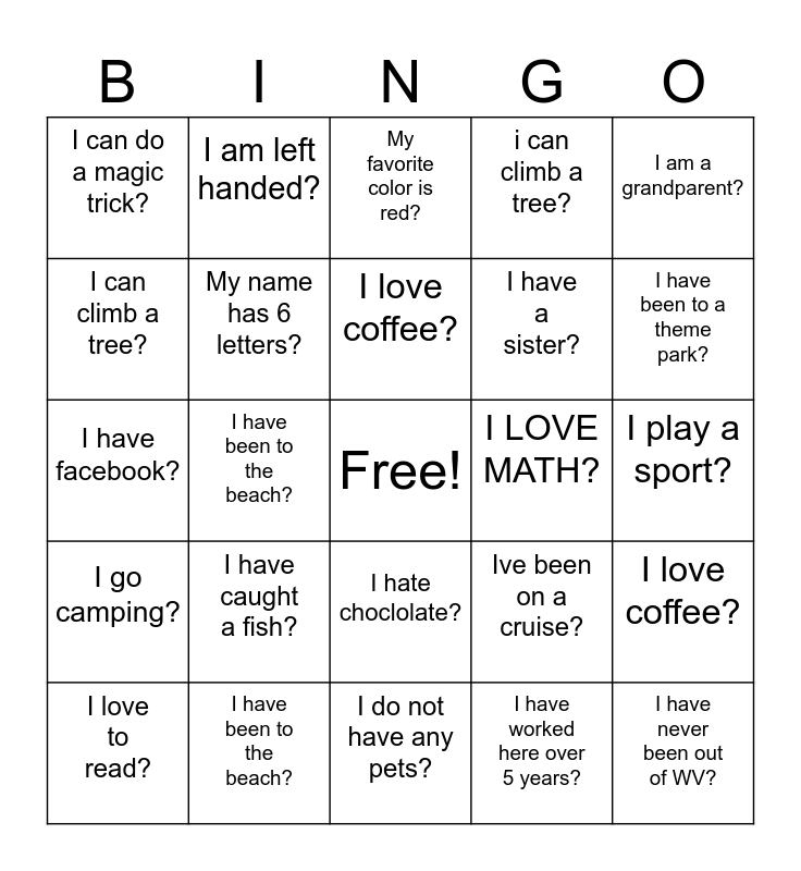 This bingo card has a free space and 24 words: I have caught a fish?, I have been to the beach?, I love coffee?, I love to read?, I am a grandparent?, I can do a magic trick?, I can climb a tree?, I am left handed?, I LOVE MATH?, I hate choclolate?, I have a sister?, I have facebook?, Ive been on a cruise?, I love coffee?, My name has 6 letters?, I have worked here over 5 years?, I play a sport?, My favorite color is red?, I have been to a theme park?, I have been to the beach?, I have never been out of WV?, I go camping?, i can climb a tree? and I do not have any pets?.