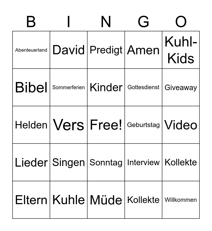 This bingo card has a free space and 24 words: Singen, Kuhle, Kinder, Eltern, Kuhl-Kids, Abenteuerland, Bibel, David, Geburtstag, Sonntag, Gottesdienst, Helden, Interview, Kollekte, Sommerferien, Kollekte, Video, Predigt, Giveaway, Vers, Willkommen, Lieder, Amen and Müde.