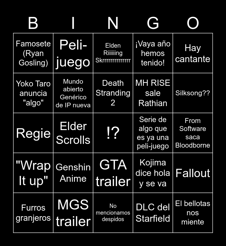This bingo card has a free space and 24 words: Genshin Anime, MGS trailer, Death Stranding 2, Furros granjeros, Hay cantante, Famosete (Ryan Gosling), Yoko Taro anuncia "algo", Peli-juego, Serie de algo que es ya una peli-juego, GTA trailer, MH RISE sale Rathian, Regie, Kojima dice hola y se va, Fallout, Mundo abierto Genérico de IP nueva, DLC del Starfield, From Software saca Bloodborne, Elden Riiiiiing Skrrrrrrrrrrrrrr, Silksong??, Elder Scrolls, El bellotas nos miente, "Wrap It up", ¡Vaya año hemos tenido! and No mencionamos despidos.