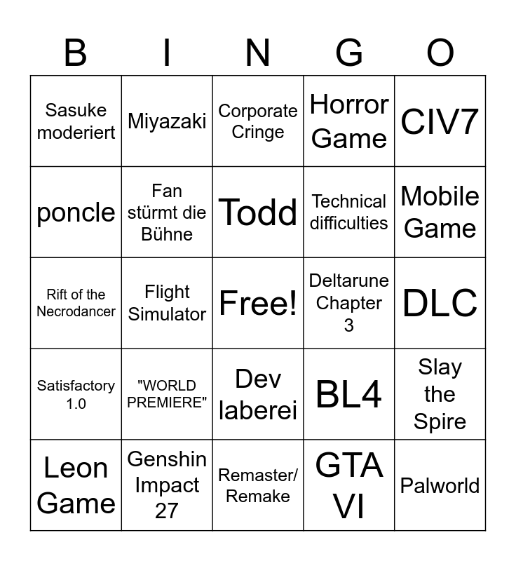 This bingo card has a free space and 24 words: "WORLD PREMIERE", Genshin Impact 27, Todd, Leon Game, CIV7, Sasuke moderiert, poncle, Miyazaki, Deltarune Chapter 3, Dev laberei, Technical difficulties, Rift of the Necrodancer, BL4, Slay the Spire, Fan stürmt die Bühne, GTA VI, DLC, Corporate Cringe, Mobile Game, Flight Simulator, Palworld, Satisfactory 1.0, Horror Game and Remaster/ Remake.