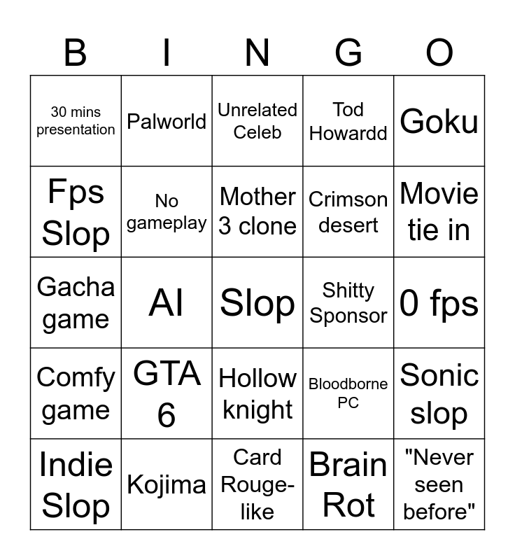 This bingo card has a free space and 24 words: GTA 6, Kojima, Mother 3 clone, Indie Slop, Goku, 30 mins presentation, Fps Slop, Palworld, Shitty Sponsor, Hollow knight, Crimson desert, Gacha game, Bloodborne PC, Sonic slop, No gameplay, Brain Rot, 0 fps, Unrelated Celeb, Movie tie in, AI, "Never seen before", Comfy game, Tod Howardd and Card Rouge-like.