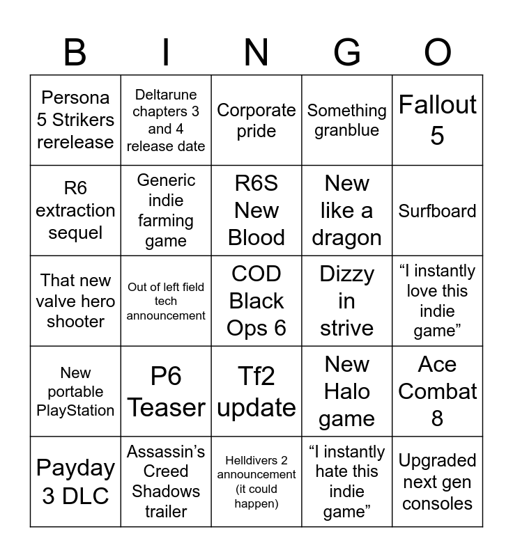 This bingo card has a free space and 24 words: P6 Teaser, Assassin’s Creed Shadows trailer, R6S New Blood, Payday 3 DLC, Fallout 5, Persona 5 Strikers rerelease, R6 extraction sequel, Deltarune chapters 3 and 4 release date, Dizzy in strive, Tf2 update, New like a dragon, That new valve hero shooter, New Halo game, Ace Combat 8, Generic indie farming game, “I instantly hate this indie game”, “I instantly love this indie game”, Corporate pride, Surfboard, Out of left field tech announcement, Upgraded next gen consoles, New portable PlayStation, Something granblue and Helldivers 2 announcement (it could happen).