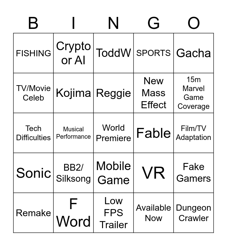 This bingo card has a free space and 24 words: BB2/ Silksong, F Word, Reggie, Remake, Gacha, FISHING, TV/Movie Celeb, Crypto or AI, Fable, Mobile Game, New Mass Effect, Tech Difficulties, VR, Fake Gamers, Kojima, Available Now, Film/TV Adaptation, ToddW, 15m Marvel Game Coverage, Musical Performance, Dungeon Crawler, Sonic, SPORTS and Low FPS Trailer.