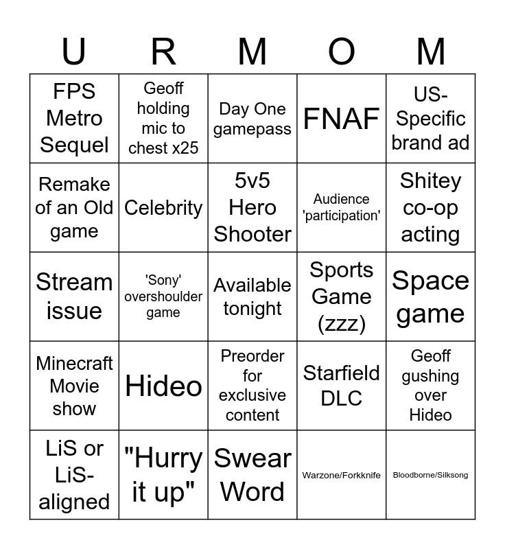 This bingo card has a free space and 24 words: Hideo, "Hurry it up", 5v5 Hero Shooter, LiS or LiS-aligned, US-Specific brand ad, FPS Metro Sequel, Remake of an Old game, Geoff holding mic to chest x25, Sports Game (zzz), Preorder for exclusive content, Audience 'participation', Stream issue, Starfield DLC, Geoff gushing over Hideo, Celebrity, Warzone/Forkknife, Space game, Day One gamepass, Shitey co-op acting, 'Sony' overshoulder game, Bloodborne/Silksong, Minecraft Movie show, FNAF and Swear Word.