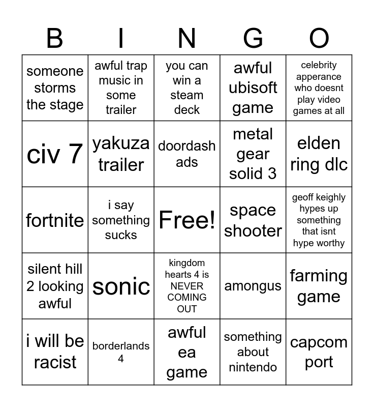 This bingo card has a free space and 24 words: sonic, borderlands 4, doordash ads, i will be racist, celebrity apperance who doesnt play video games at all, someone storms the stage, civ 7, awful trap music in some trailer, space shooter, kingdom hearts 4 is NEVER COMING OUT, metal gear solid 3, fortnite, amongus, farming game, yakuza trailer, something about nintendo, geoff keighly hypes up something that isnt hype worthy, you can win a steam deck, elden ring dlc, i say something sucks, capcom port, silent hill 2 looking awful, awful ubisoft game and awful ea game.