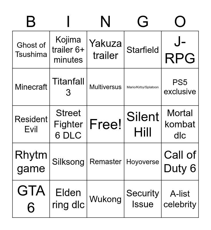 This bingo card has a free space and 24 words: Silksong, Elden ring dlc, Multiversus, GTA 6, J-RPG, Ghost of Tsushima, Minecraft, Kojima trailer 6+ minutes, Silent Hill, Remaster, Mario/Kirby/Splatoon, Resident Evil, Hoyoverse, Call of Duty 6, Titanfall 3, Security Issue, Mortal kombat dlc, Yakuza trailer, PS5 exclusive, Street Fighter 6 DLC, A-list celebrity, Rhytm game, Starfield and Wukong.