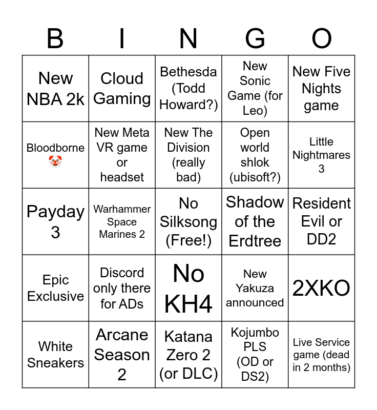 This bingo card has a free space and 24 words: Discord only there for ADs, Arcane Season 2, New The Division (really bad), White Sneakers, New Five Nights game, New NBA 2k, Bloodborneš¤”, Cloud Gaming, Shadow of the Erdtree, No KH4, Open world shlok (ubisoft?), Payday 3, New Yakuza announced, 2XKO, New Meta VR game or headset, Kojumbo PLS (OD or DS2), Resident Evil or DD2, Bethesda (Todd Howard?), Little Nightmares 3, Warhammer Space Marines 2, Live Service game (dead in 2 months), Epic Exclusive, New Sonic Game (for Leo) and Katana Zero 2 (or DLC).