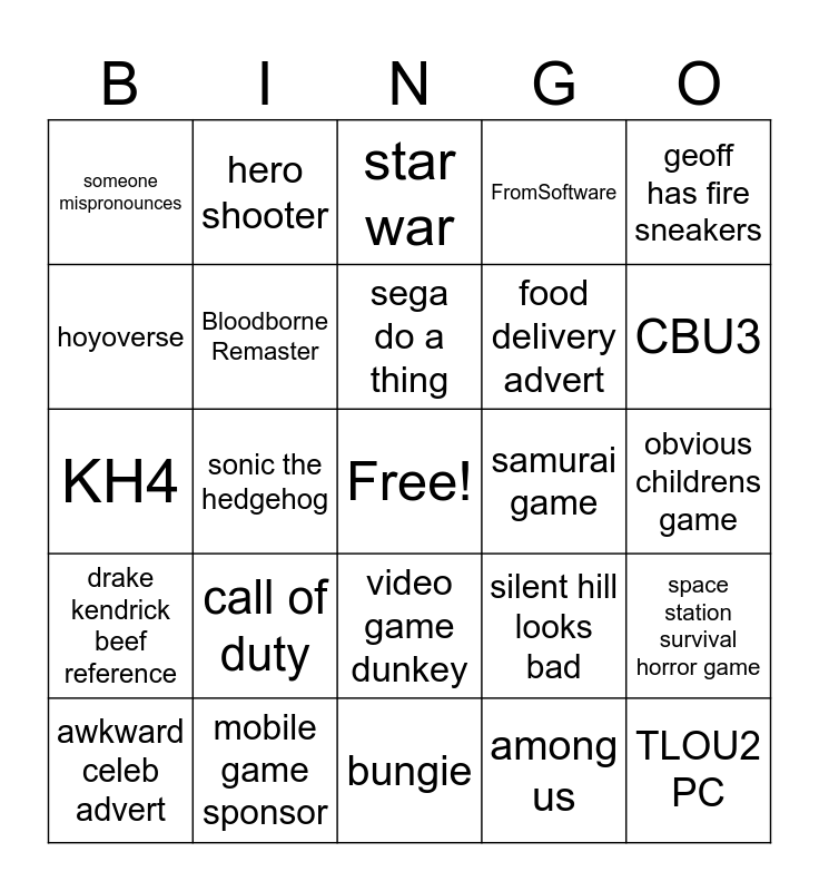 This bingo card has a free space and 24 words: call of duty, mobile game sponsor, sega do a thing, awkward celeb advert, geoff has fire sneakers, someone mispronounces, hoyoverse, hero shooter, samurai game, video game dunkey, food delivery advert, KH4, silent hill looks bad, space station survival horror game, Bloodborne Remaster, among us, obvious childrens game, star war, CBU3, sonic the hedgehog, TLOU2 PC, drake kendrick beef reference, FromSoftware and bungie.