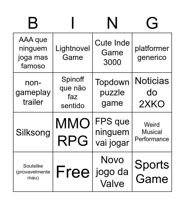 This bingo card has 16 words: Free, Weird Musical Performance, Cute Inde Game 3000, AAA que ninguem joga mas famoso, Silksong, Lightnovel Game, FPS que ninguem vai jogar, Novo jogo da Valve, non-gameplay trailer, Spinoff que não faz sentido, Soulslike (provavelmente mau), platformer generico, MMO RPG, Noticias do 2XKO, Topdown puzzle game and Sports Game.