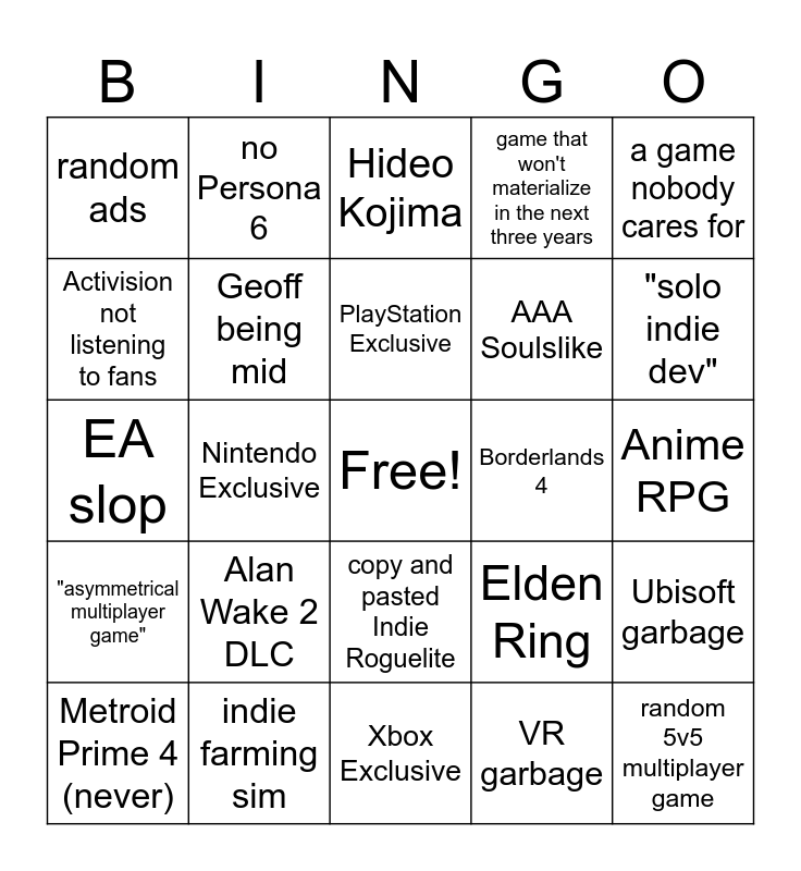 This bingo card has a free space and 24 words: Alan Wake 2 DLC, indie farming sim, PlayStation Exclusive, Metroid Prime 4 (never), a game nobody cares for, random ads, Activision not listening to fans, no Persona 6, Borderlands 4, copy and pasted Indie Roguelite, AAA Soulslike, EA slop, Elden Ring, Ubisoft garbage, Geoff being mid, VR garbage, Anime RPG, Hideo Kojima, "solo indie dev", Nintendo Exclusive, random 5v5 multiplayer game, "asymmetrical multiplayer game", game that won't materialize in the next three years and Xbox Exclusive.