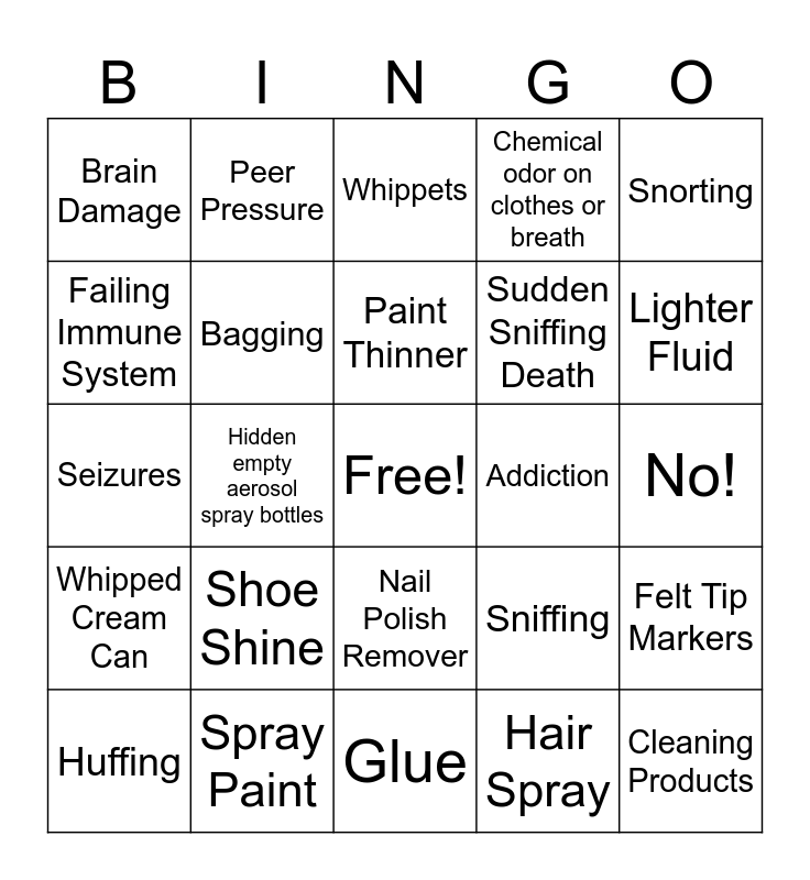 This bingo card has a free space and 26 words: Nail Polish Remover, Hair Spray, Paint Thinner, Spray Paint, Snorting, Brain Damage, Failing Immune System, Peer Pressure, No!, Sniffing, Sudden Sniffing Death, Seizures, Felt Tip Markers, Huffing, Hidden empty aerosol spray bottles, Paint or other stains on hands, face, clothes, Chemical odor on clothes or breath, Whipped Cream Can, Whippets, Cleaning Products, Lighter Fluid, Glue, Addiction, Shoe Shine, Bagging and Chroming.