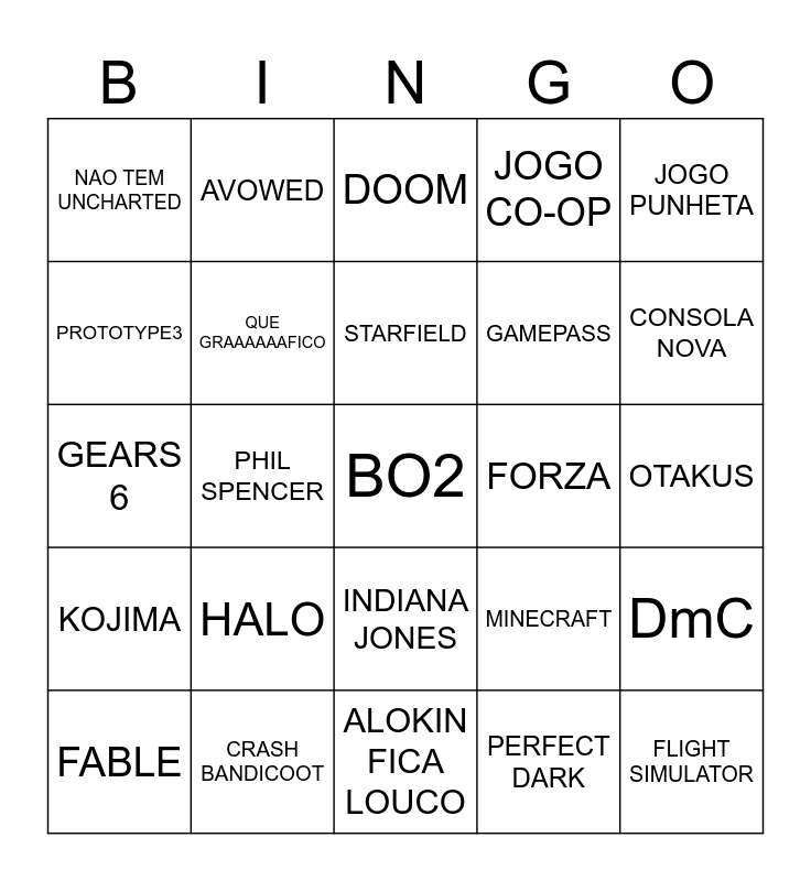 This bingo card has a free space and 24 words: HALO, CRASH BANDICOOT, STARFIELD, FABLE, JOGO PUNHETA, NAO TEM UNCHARTED, PROTOTYPE3, AVOWED, FORZA, INDIANA JONES, GAMEPASS, GEARS 6, MINECRAFT, DmC, QUE GRAAAAAAFICO, PERFECT DARK, OTAKUS, DOOM, CONSOLA NOVA, PHIL SPENCER, FLIGHT SIMULATOR, KOJIMA, JOGO CO-OP and ALOKIN FICA LOUCO.