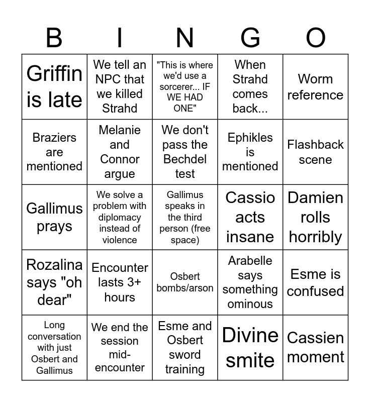 This bingo card has a free space and 24 words: Encounter lasts 3+ hours, We end the session mid-encounter, We don't pass the Bechdel test, Long conversation with just Osbert and Gallimus, Worm reference, Griffin is late, Braziers are mentioned, We tell an NPC that we killed Strahd, Cassio acts insane, Osbert bombs/arson, Ephikles is mentioned, Gallimus prays, Arabelle says something ominous, Esme is confused, Melanie and Connor argue, Divine smite, Damien rolls horribly, "This is where we'd use a sorcerer... IF WE HAD ONE", Flashback scene, We solve a problem with diplomacy instead of violence, Cassien moment, Rozalina says "oh dear", When Strahd comes back... and Esme and Osbert sword training.