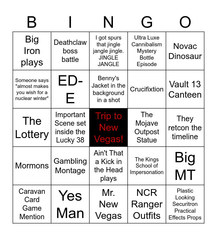 This bingo card has a free space and 24 words: Gambling Montage, Yes Man, Benny's Jacket in the background in a shot, Caravan Card Game Mention, Novac Dinosaur, Big Iron plays, Someone says "almost makes you wish for a nuclear winter", Deathclaw boss battle, The Mojave Outpost Statue, Ain't That a Kick in the Head plays, Crucifixtion, The Lottery, The Kings School of Impersonation, Big MT, ED-E, NCR Ranger Outfits, They retcon the timeline, I got spurs that jingle jangle jingle. JINGLE JANGLE, Vault 13 Canteen, Important Scene set inside the Lucky 38, Plastic Looking Securitron Practical Effects Props, Mormons, Ultra Luxe Cannibalism Mystery Bottle Episode and Mr. New Vegas.