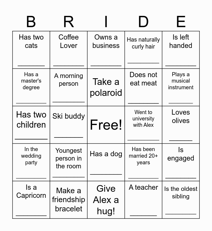 This bingo card has a free space and 24 words: Youngest person in the room _________, Make a friendship bracelet, Take a polaroid, Is a Capricorn ________, Is left handed ________, Has two cats _______, Has a master's degree __________, Coffee Lover ________, Went to university with Alex ___________, Has a dog ________, Does not eat meat ________, Has two children _______, Has been married 20+ years __________, Is engaged ________, A morning person _________, A teacher _______, Loves olives ______, Owns a business ________, Plays a musical instrument ________, Ski buddy _______, Is the oldest sibling _________, In the wedding party __________, Has naturally curly hair __________ and Give Alex a hug!.