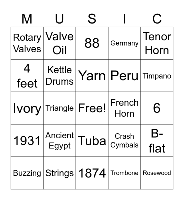 This bingo card has a free space and 24 words: Buzzing, Ancient Egypt, Yarn, Trombone, Tenor Horn, Rotary Valves, Valve Oil, 88, French Horn, 6, Ivory, Kettle Drums, Crash Cymbals, B-flat, 4 feet, Strings, 1874, Germany, Timpano, 1931, Triangle, Tuba, Peru and Rosewood.