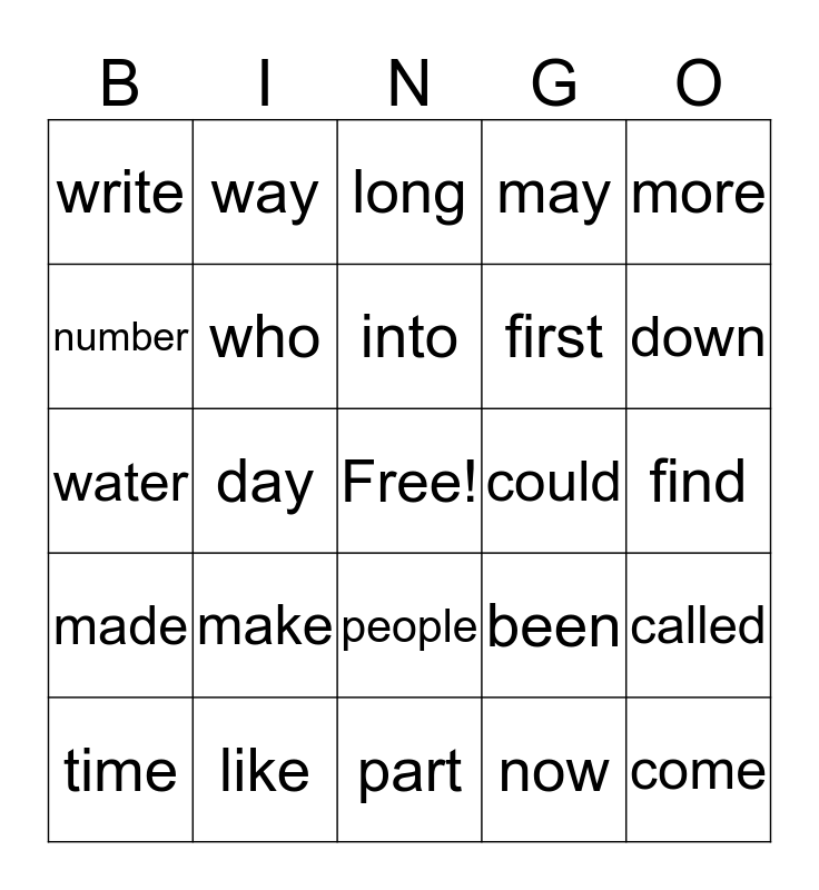 This bingo card has a free space and 24 words: make, like, into, time, more, write, number, way, could, people, first, water, been, called, who, now, find, long, down, day, come, made, may and part.