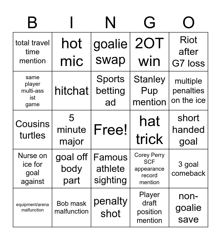 This bingo card has a free space and 36 words: Canada cup drought mention, Bennet dirty hit, Kane dirty hit, hitchat, Corey Perry SCF appearance record mention, Nurse on ice for goal against, Sports betting ad, Goalie highlight save, Riot after G7 loss, Hyman asshole goal, 5 minute major, 2OT win, 5 minute SOGless, hat trick, multiple penalties on the ice, total travel time mention, celebrity sighting, goal off body part, non-goalie save, goalie swap, short handed goal, 3 goal comeback, Bob mask malfunction, equipment/arena malfunction, penalty shot, hot mic, Cousins turtles, goaltender interference, Stanley Pup mention, same player multi-assist game, Paul Maurice sassy soundbite, Gene in costume, Player draft position mention, Famous athlete sighting, Goal disallowed and player called "underrated".