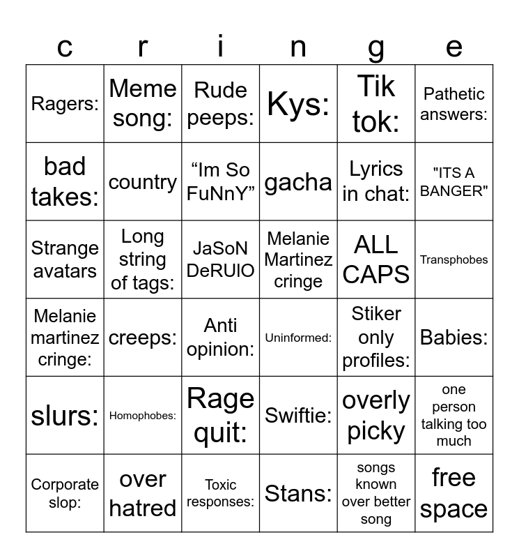 This bingo card has 54 words: stans, Melanie Martinez cringe, Christians:, Homophobes:, Transphobes, free space, Kys:, Racism:, Pathetic answers:, Arguments:, Ragers:, Stans:, Uninformed:, Anti opinion:, Do to artist picks:, Stiker only profiles:, Strange avatars, “Im So FuNnY”, "NO!", JaSoN DeRUlO, Melanie martinez cringe:, Rage quit:, Long string of tags:, Tik tok:, Vote chatter:, Meme song:, Corporate slop:, “Im so quirky”:, Swiftie:, Babies:, Teasy songs:, Toxic responses:, Coward:, old song > new song, Rude peeps:, songs known over better song, Lyrics in chat:, creeps:, slurs:, bad takes:, excessive lineup picker, boring song, pick me's, chat issues, ALL CAPS, annoying song, over hatred, overly picky, country, "ITS A BANGER", gacha, broken English, one person talking too much and enimen wins too much.
