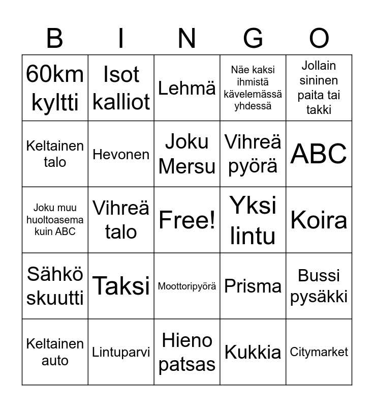This bingo card has a free space and 29 words: Keltainen auto, Pyörä sininen, Vihreä talo, 40 km kyltti, 60km kyltti, Lehmä, Hevonen, Taksi, Yksi lintu, Lintuparvi, Koira, Citymarket, Hieno patsas, Kukkia, ABC, Neste K, Moottoripyörä, Sähkö skuutti, Jollain sininen paita tai takki, Joku muu huoltoasema kuin ABC, Prisma, Maantie, Vihreä pyörä, Keltainen talo, Näe kaksi ihmistä kävelemässä yhdessä, Isot kalliot, Bussi pysäkki, Joku Mersu and Joku tesla-auto.