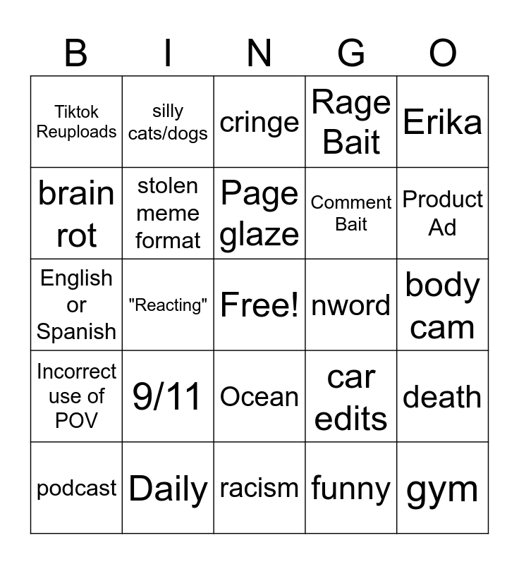 This bingo card has a free space and 24 words: 9/11, Daily, Page glaze, podcast, Erika, Tiktok Reuploads, brain rot, silly cats/dogs, nword, Ocean, Comment Bait, English or Spanish, car edits, death, stolen meme format, funny, body cam, cringe, Product Ad, "Reacting", gym, Incorrect use of POV, Rage Bait and racism.