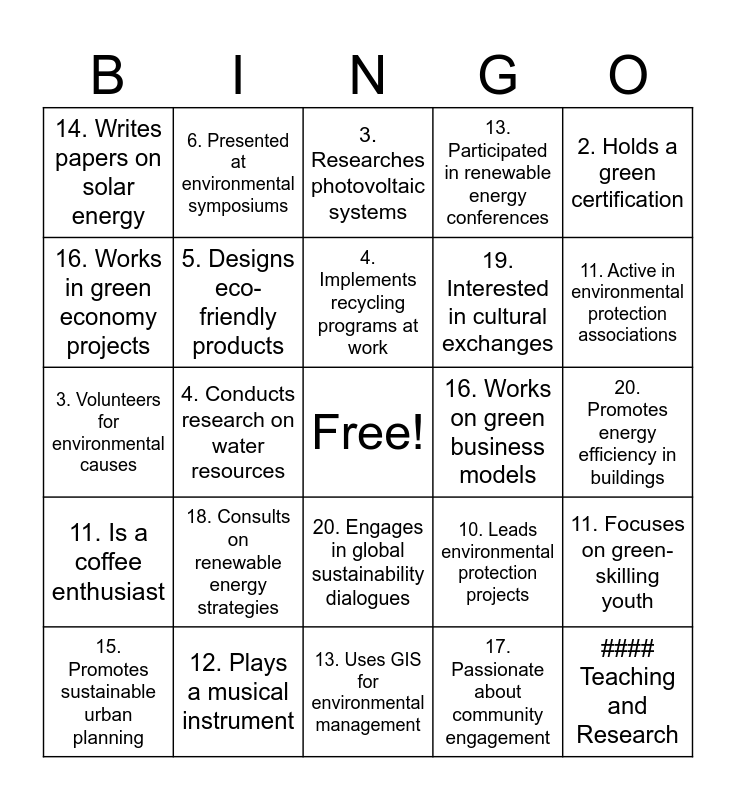 This bingo card has a free space and 81 words: 1. Installed solar panels at home, 2. Works in wind energy sector, 3. Researches photovoltaic systems, 4. Teaches renewable energy courses, 5. Develops green hydrogen projects, 6. Advises on power-to-x technologies, 7. Manages renewable energy projects, 8. Conducts workshops on sustainable energy, 9. Advocates for renewable energy policies, 10. Involved in concentrating solar power systems, 11. Works on solar desalination processes, 12. Developed solar cooling systems, 13. Participated in renewable energy conferences, 14. Writes papers on solar energy, 15. Designs renewable energy curriculums, 16. Works in green economy projects, 17. Has experience in energy transition, 18. Consults on renewable energy strategies, 19. Coordinates renewable energy R&D projects, 20. Promotes energy efficiency in buildings, 1. Practices composting at home, 2. Holds a green certification, 3. Volunteers for environmental causes, 4. Implements recycling programs at work, 5. Designs eco-friendly products, 6. Specializes in sustainable agriculture, 7. Teaches environmental science, 8. Conducts research on biodiversity, 9. Participates in green entrepreneurship, 10. Works on climate resilience projects, 11. Active in environmental protection associations, 12. Manages water resources sustainably, 13. Uses GIS for environmental management, 14. Develops green building designs, 15. Promotes sustainable urban planning, 16. Works on green business models, 17. Organizes environmental awareness workshops, 18. Manages waste reduction initiatives, 19. Researches sustainable development strategies, 20. Participates in green skills training programs, #### Teaching and Research, 1. Published papers on climate change, 2. Teaches environmental science courses, 3. Mentors students in green technology, 4. Conducts research on water resources, 5. Develops curriculum on sustainability, 6. Presented at environmental symposiums, 7. Works on renewable energy projects, 8. Supervises PhD and Master's students, 9. Specializes in sustainable development, 10. Leads environmental protection projects, 11. Focuses on green-skilling youth, 12. Develops international research collaborations, 13. Researches bioactive substances for sustainability, 14. Works on environmental policy development, 15. Conducts interdisciplinary research, 16. Studies the impact of environmental pollutants, 17. Teaches courses on energy efficiency, 18. Coordinates educational exchange programs, 19. Participates in educational reform initiatives, 20. Engages in global sustainability dialogues, 1. Comes from Jordan, 2. Comes from Tunisia, 3. Comes from Tlemcen, 4. Comes from Lebanon, 5. Comes from Egypt, 6. Loves hiking in nature, 7. Enjoys gardening, 8. Speaks more than two languages, 9. Has a pet cat, 10. Loves to cook, 11. Is a coffee enthusiast, 12. Plays a musical instrument, 13. Has a unique hobby, 14. Works for an NGO, 15. Has lived in multiple countries, 16. Enjoys teaching and mentoring, 17. Passionate about community engagement, 18. Advocates for gender equality, 19. Interested in cultural exchanges and 20. Dedicated to lifelong learning.
