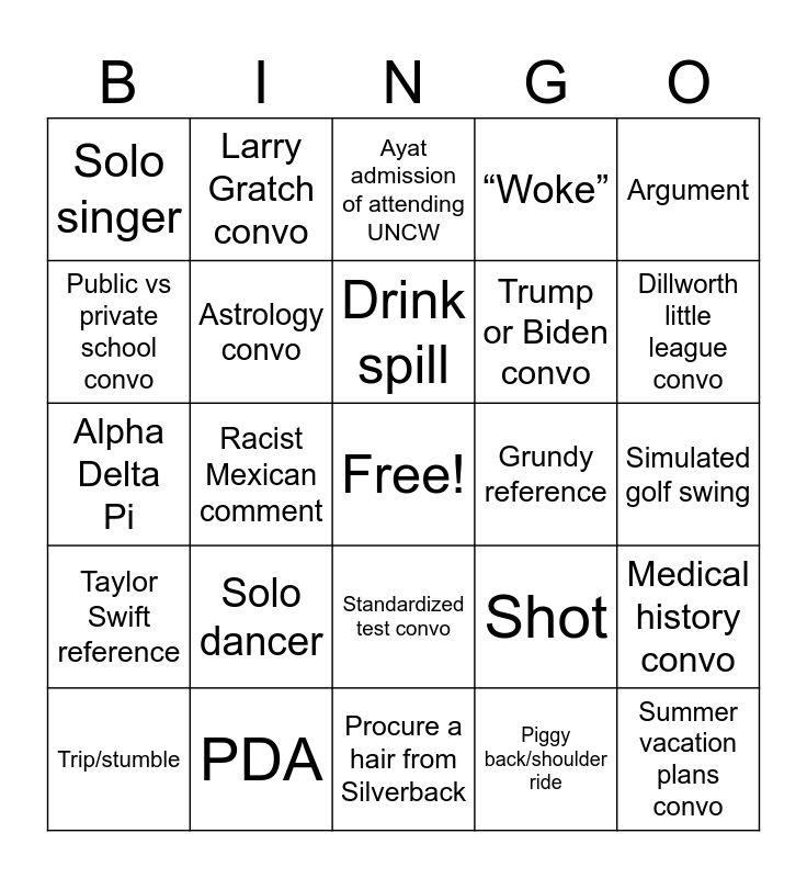This bingo card has a free space and 24 words: Solo dancer, PDA, Drink spill, Trip/stumble, Argument, Solo singer, Public vs private school convo, Larry Gratch convo, Grundy reference, Standardized test convo, Trump or Biden convo, Alpha Delta Pi, Shot, Medical history convo, Astrology convo, Piggy back/shoulder ride, Simulated golf swing, Ayat admission of attending UNCW, Dillworth little league convo, Racist Mexican comment, Summer vacation plans convo, Taylor Swift reference, “Woke” and Procure a hair from Silverback.