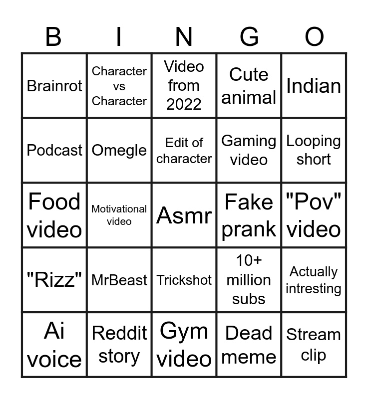 This bingo card has a free space and 24 words: MrBeast, Reddit story, Edit of character, Ai voice, Indian, Brainrot, Podcast, Character vs Character, Fake prank, Trickshot, Gaming video, Food video, 10+ million subs, Actually intresting, Omegle, Dead meme, "Pov" video, Video from 2022, Looping short, Motivational video, Stream clip, "Rizz", Cute animal and Gym video.