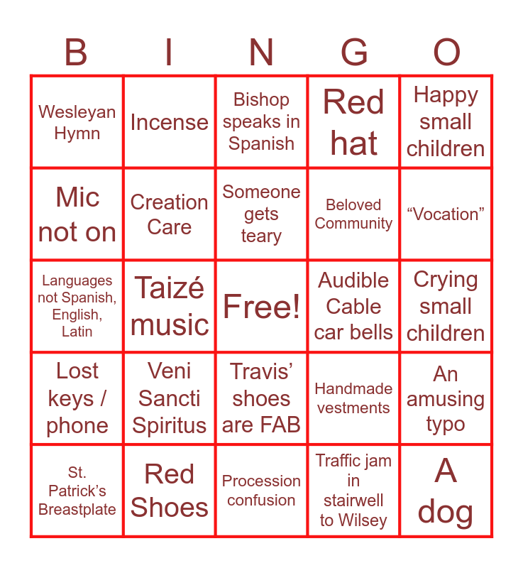 This bingo card has a free space and 24 words: Veni Sancti Spiritus, Red Shoes, Someone gets teary, St. Patrick’s Breastplate, Happy small children, Wesleyan Hymn, Mic not on, Incense, Audible Cable car bells, Travis’ shoes are FAB, Beloved Community, Languages not Spanish, English, Latin, Handmade vestments, An amusing typo, Creation Care, Traffic jam in stairwell to Wilsey, Crying small children, Bishop speaks in Spanish, “Vocation”, Taizé music, A dog, Lost keys / phone, Red hat and Procession confusion.
