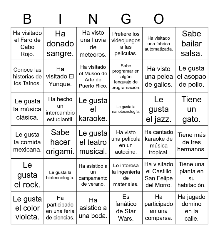 This bingo card has 173 words: Ha hecho voluntariado., Usa bicicleta para ir a la escuela., Tiene alergia a algo., Le gusta el helado de chocolate., Le gusta el karaoke., Le gusta resolver problemas matemáticos., Ha bailado salsa o merengue., Ha visitado un laboratorio de investigación., Le gusta el anime., Habla más de un idioma., Le gusta coleccionar algo (sellos, monedas, etc.)., Le gusta hacer rompecabezas., Ha visto una pelea de gallos., Ha construido un robot., Le gusta la música clásica., Le gusta el bacalaíto., Tiene un gato., Le gusta la yuca con mojo., Tiene un apodo., Ha visitado la Isla de Culebra., Le gusta la mitología., Ha visitado el Observatorio de Arecibo antes de su colapso., Ha participado en una obra de teatro., Es fan de Marvel., Ha celebrado las Fiestas de la Calle San Sebastián., Ha visitado el Parque de Bombas en Ponce., Prefiere los gatos a los perros., Ha viajado fuera del país., Le gusta el arroz con dulce., Ha participado en un club de ciencias., Le gusta trabajar en equipo para resolver problemas., Ha visto los festivales de bombas y plenas., Le gusta la carne guisada., Le gusta la música de Bad Bunny., Es fanático de Star Wars., Prefiere el té al café., Ha participado en una protesta., Sabe hacer malabares., Le gusta la jardinería., Le interesa la ingeniería química., Prefiere las series a las películas., Tiene familiares en Estados Unidos., Prefiere la comida vegetariana., Le gusta el arte callejero., Le gusta el sancocho., Ha hecho un proyecto de impresión 3D., Le gusta la historia., Ha ganado algún premio o competencia., Ha asistido a un campamento de verano., Ha ganado una medalla deportiva., Ha hecho un curso en línea., Ha ido a una fiesta patronal., Ha visitado el Museo de Arte de Puerto Rico., Ha participado en una feria de ciencias., Ha participado en una parranda navideña., Le gusta el color violeta., Toca la guitarra., Le gusta la biotecnología., Es fanático de Harry Potter., Prefiere la sopa de plátano., Le gusta la nanotecnología., Ha visitado el Faro de Cabo Rojo., Le gusta la fotografía., Ha participado en una comparsa., Juega al fútbol., Ha hecho una fogata en la playa., Ha hecho una presentación en clase., Le gusta la pizza., Le gusta el lechón asado., Ha visto una película en un autocine., Le gusta cocinar., Tiene un perro., Ha visitado una fábrica automatizada., Prefiere el pastelón a la lasaña., Ha probado una dieta vegana., Ha organizado un evento escolar., Tiene más de tres hermanos., Ha ido a un concierto., Ha probado la alcapurria., Ha leído libros sobre ciencia y tecnología., Prefiere las clases en línea., Le interesa la ingeniería mecánica., Sabe nadar., Le gusta desarmar y armar aparatos electrónicos., Ha vivido en más de una ciudad., Le gusta la poesía., Prefiere la pizza sin piña., Le gusta la comida picante., Tiene un tatuaje., Ha donado sangre., Le gusta la arquitectura., Ha leído un libro este mes., Sabe tocar el piano., Conoce las historias de los Taínos., Le gusta la comida mexicana., Ha visto una lluvia de meteoros., Prefiere los días lluviosos a los soleados., Le gusta la astronomía., Tiene una planta en su habitación., Ha visto a Calle 13 en concierto., Ha probado mofongo., Le gusta el jazz., Prefiere las películas de terror., Le gusta el teatro musical., Ha viajado en la lancha de Cataño a San Juan., Ha hecho una cápsula del tiempo., Prefiere la arepa de coco., Ha participado en una cabalgata., Ha construido un cohete casero., Prefiere la montaña a la playa., Ha hecho un “chinchorreo” con amigos., Ha escrito un poema., Le gusta la ciencia ficción., Ha aprendido a hacer una manualidad., Ha adoptado una mascota de un refugio., Prefiere el café puertorriqueño., Le gusta la quenepa., Ha asistido a una boda., Es hijo único., Ha participado en una competencia de matemáticas., Ha visitado el Castillo San Felipe del Morro., Ha visitado la plaza de Ponce., Prefiere el invierno al verano., Sabe hacer origami., Ha participado en un maratón., Ha aprendido a tocar un instrumento de viento., Le gusta la música electrónica., Tiene un blog o canal de YouTube., Es miembro del consejo estudiantil., Ha visto una serie completa en un solo fin de semana., Prefiere los libros a las películas., Ha celebrado Noche de San Juan en la playa., Tiene un trabajo de medio tiempo., Ha visitado las cuevas de Camuy., Le gusta el senderismo., Le gusta el asopao de pollo., Ha participado en un club de debate., Le encanta el arroz con gandules., Le gusta el yoga o la meditación., Es zurdo., Ha visitado El Yunque., Ha escrito una carta a mano en el último año., Ha nadado en una playa bioluminiscente., Ha acampado alguna vez., Ha visto el Festival de Máscaras de Hatillo., Ha visitado un parque nacional., Ha hecho un intercambio estudiantil., Ha hecho senderismo en El Yunque., Prefiere las películas de comedia., Ha jugado domino en la calle., Sabe bailar salsa., Sabe programar en algún lenguaje de programación., Ha hecho un proyecto de energía solar., Ha probado el tembleque., Ha cantado karaoke de música tropical., Ha jugado pelota en la calle., Conoce el legado de Roberto Clemente., Ha visitado Viejo San Juan., Le gusta el rock., Ha bailado plena en una fiesta., Prefiere los videojuegos a las películas., Es miembro de algún club escolar., Ha practicado algún deporte extremo., Le gusta dibujar o pintar., Le gusta la comida italiana., Prefiere la piña colada., Sabe hablar en público., Le interesa la ingeniería civil., Le interesa la ingeniería de materiales., Tiene un reloj inteligente., Usa lentes., Ha participado en un concurso de inventos. and Prefiere los plátanos maduros a los tostones..