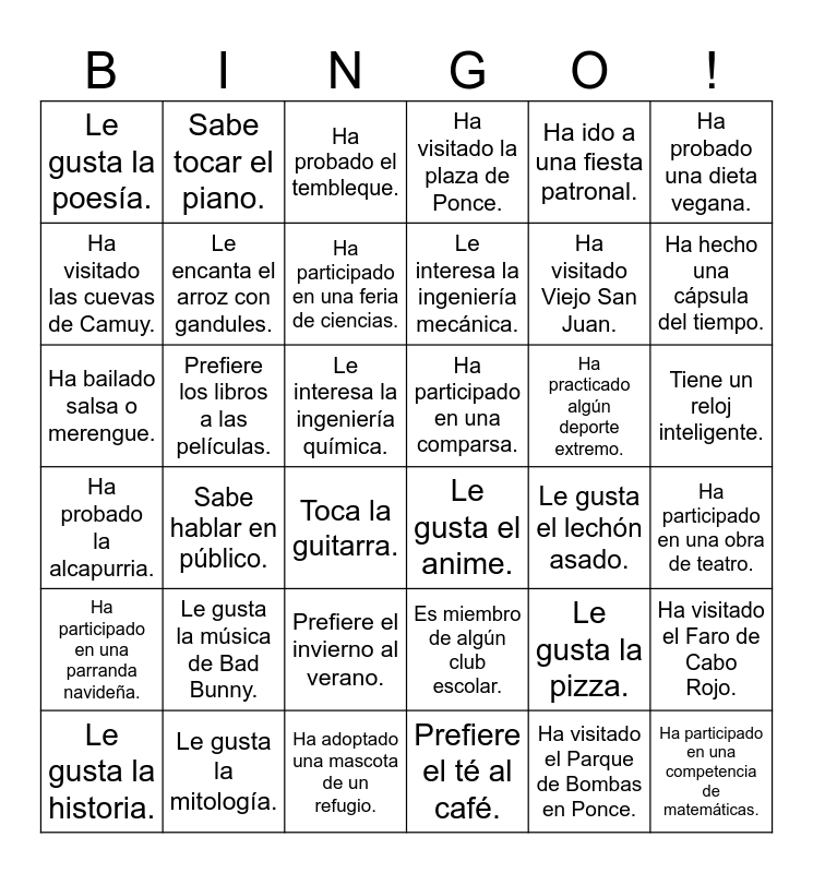 This bingo card has 173 words: Ha hecho una fogata en la playa., Ha acampado alguna vez., Ha escrito una carta a mano en el último año., Ha participado en un club de ciencias., Le interesa la ingeniería química., Sabe hacer malabares., Le gusta la carne guisada., Sabe programar en algún lenguaje de programación., Tiene un blog o canal de YouTube., Prefiere las películas de comedia., Es fan de Marvel., Ha bailado plena en una fiesta., Ha visitado Viejo San Juan., Le gusta hacer rompecabezas., Ha bailado salsa o merengue., Ha visitado el Castillo San Felipe del Morro., Tiene un reloj inteligente., Le gusta el rock., Ha participado en un concurso de inventos., Le gusta resolver problemas matemáticos., Ha jugado domino en la calle., Ha hecho un intercambio estudiantil., Ha leído libros sobre ciencia y tecnología., Ha visto a Calle 13 en concierto., Prefiere el café puertorriqueño., Ha visitado un parque nacional., Le gusta la fotografía., Ha probado mofongo., Ha visto los festivales de bombas y plenas., Sabe bailar salsa., Le gusta el asopao de pollo., Le gusta el karaoke., Ha visitado el Museo de Arte de Puerto Rico., Ha hecho un proyecto de impresión 3D., Prefiere el té al café., Le gusta coleccionar algo (sellos, monedas, etc.)., Prefiere las películas de terror., Le gusta desarmar y armar aparatos electrónicos., Conoce el legado de Roberto Clemente., Prefiere la montaña a la playa., Le gusta dibujar o pintar., Tiene un trabajo de medio tiempo., Le gusta la música clásica., Ha organizado un evento escolar., Ha visitado una fábrica automatizada., Le gusta la jardinería., Ha hecho una presentación en clase., Ha donado sangre., Prefiere el invierno al verano., Le gusta la comida picante., Ha leído un libro este mes., Usa bicicleta para ir a la escuela., Ha participado en una feria de ciencias., Le gusta la mitología., Es miembro del consejo estudiantil., Le gusta la historia., Tiene más de tres hermanos., Le gusta la música de Bad Bunny., Juega al fútbol., Ha visitado el Observatorio de Arecibo antes de su colapso., Ha participado en una comparsa., Le gusta la poesía., Prefiere la comida vegetariana., Ha visitado el Parque de Bombas en Ponce., Ha celebrado Noche de San Juan en la playa., Le gusta la arquitectura., Ha visto el Festival de Máscaras de Hatillo., Ha visto una lluvia de meteoros., Ha visto una serie completa en un solo fin de semana., Le gusta el anime., Ha participado en una protesta., Le gusta la música electrónica., Ha ido a una fiesta patronal., Le gusta el yoga o la meditación., Es fanático de Harry Potter., Habla más de un idioma., Ha participado en una obra de teatro., Prefiere los videojuegos a las películas., Ha visitado la Isla de Culebra., Le gusta el senderismo., Prefiere los plátanos maduros a los tostones., Ha hecho un curso en línea., Ha visitado un laboratorio de investigación., Ha hecho senderismo en El Yunque., Le gusta la yuca con mojo., Ha construido un cohete casero., Tiene un perro., Ha participado en una cabalgata., Le gusta el helado de chocolate., Sabe tocar el piano., Ha jugado pelota en la calle., Ha visto una pelea de gallos., Sabe hacer origami., Ha visitado las cuevas de Camuy., Ha probado la alcapurria., Ha probado el tembleque., Le interesa la ingeniería de materiales., Ha participado en un club de debate., Ha visitado el Faro de Cabo Rojo., Prefiere el pastelón a la lasaña., Tiene familiares en Estados Unidos., Ha practicado algún deporte extremo., Le gusta la comida italiana., Toca la guitarra., Le gusta la quenepa., Ha ido a un concierto., Es fanático de Star Wars., Ha hecho un proyecto de energía solar., Ha asistido a un campamento de verano., Ha visitado El Yunque., Prefiere la sopa de plátano., Le gusta el teatro musical., Ha nadado en una playa bioluminiscente., Le gusta la nanotecnología., Ha participado en un maratón., Tiene un gato., Ha viajado fuera del país., Ha adoptado una mascota de un refugio., Le gusta el sancocho., Ha celebrado las Fiestas de la Calle San Sebastián., Le gusta la pizza., Prefiere las clases en línea., Le gusta la comida mexicana., Sabe hablar en público., Le gusta el jazz., Usa lentes., Prefiere los gatos a los perros., Le gusta la ciencia ficción., Prefiere la pizza sin piña., Ha aprendido a hacer una manualidad., Le gusta cocinar., Ha escrito un poema., Es zurdo., Ha ganado algún premio o competencia., Ha visto una película en un autocine., Ha hecho una cápsula del tiempo., Le gusta la astronomía., Ha asistido a una boda., Prefiere la arepa de coco., Tiene un tatuaje., Le encanta el arroz con gandules., Ha aprendido a tocar un instrumento de viento., Ha viajado en la lancha de Cataño a San Juan., Ha hecho voluntariado., Le gusta el arte callejero., Sabe nadar., Prefiere los libros a las películas., Prefiere la piña colada., Tiene un apodo., Ha participado en una competencia de matemáticas., Ha probado una dieta vegana., Le interesa la ingeniería mecánica., Le interesa la ingeniería civil., Prefiere las series a las películas., Le gusta el lechón asado., Conoce las historias de los Taínos., Ha ganado una medalla deportiva., Ha cantado karaoke de música tropical., Ha participado en una parranda navideña., Le gusta la biotecnología., Ha visitado la plaza de Ponce., Le gusta el color violeta., Le gusta trabajar en equipo para resolver problemas., Tiene una planta en su habitación., Le gusta el bacalaíto., Es hijo único., Ha hecho un “chinchorreo” con amigos., Ha construido un robot., Es miembro de algún club escolar., Ha vivido en más de una ciudad., Prefiere los días lluviosos a los soleados., Le gusta el arroz con dulce. and Tiene alergia a algo..