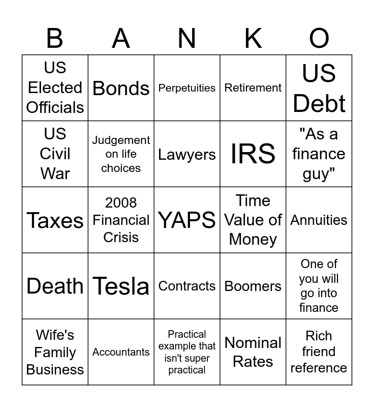 This bingo card has a free space and 24 words: Tesla, Accountants, Lawyers, Wife's Family Business, US Debt, US Elected Officials, US Civil War, Bonds, Time Value of Money, Contracts, IRS, Taxes, Boomers, One of you will go into finance, Judgement on life choices, Nominal Rates, Annuities, Perpetuities, "As a finance guy", 2008 Financial Crisis, Rich friend reference, Death, Retirement and Practical example that isn't super practical.