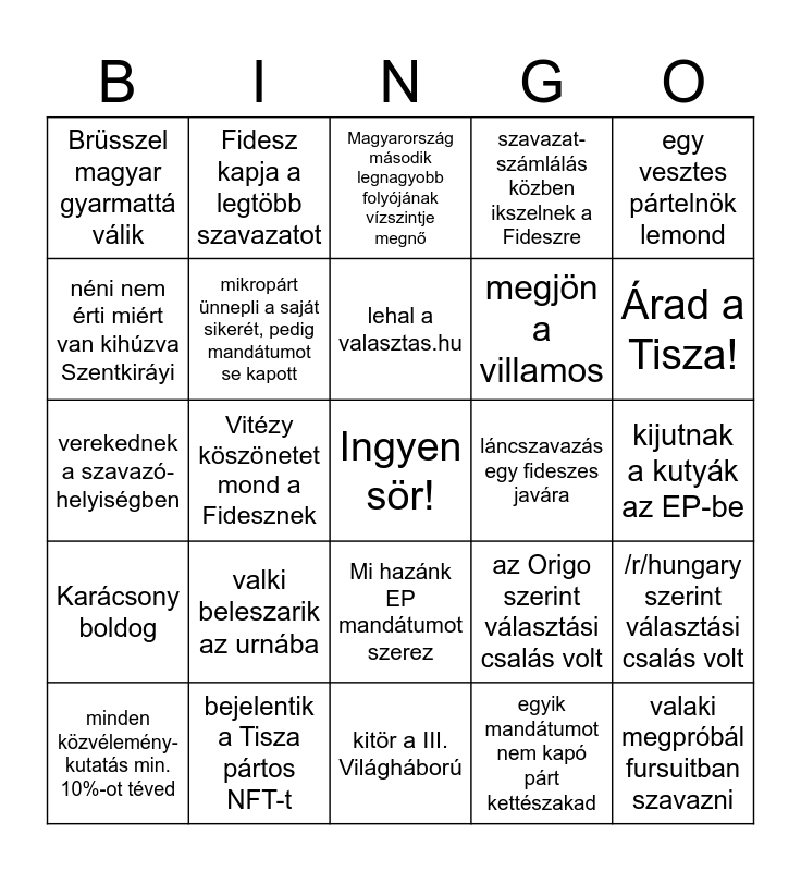 This bingo card has a free space and 24 words: valki beleszarik az urnába, bejelentik a Tisza pártos NFT-t, lehal a valasztas.hu, minden közvélemény- kutatás min. 10%-ot téved, egy vesztes pártelnök lemond, Brüsszel magyar gyarmattá válik, néni nem érti miért van kihúzva Szentkiráyi, Fidesz kapja a legtöbb szavazatot, láncszavazás egy fideszes javára, Mi hazánk EP mandátumot szerez, megjön a villamos, verekednek a szavazó-helyiségben, az Origo szerint választási csalás volt, /r/hungary szerint választási csalás volt, mikropárt ünnepli a saját sikerét, pedig mandátumot se kapott, egyik mandátumot nem kapó párt kettészakad, kijutnak a kutyák az EP-be, Magyarország második legnagyobb folyójának vízszintje megnő, Árad a Tisza!, Vitézy köszönetet mond a Fidesznek, valaki megpróbál fursuitban szavazni, Karácsony boldog, szavazat-számlálás közben ikszelnek a Fideszre and kitör a III. Világháború.