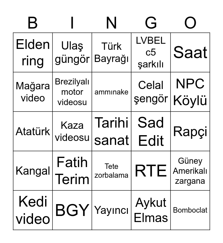 This bingo card has 25 words: Fatih Terim, Yayıncı, ammınake, Kedi video, Saat, Elden ring, Mağara video, Ulaş güngör, Sad Edit, Tete zorbalama, Celal şengör, Atatürk, RTE, Güney Amerikalı zargana, Brezilyalı motor videosu, Bomboclat, Rapçi, Türk Bayrağı, NPC Köylü, Kaza videosu, Tarihi sanat, BGY, Kangal, LVBEL c5 şarkılı and Aykut Elmas.