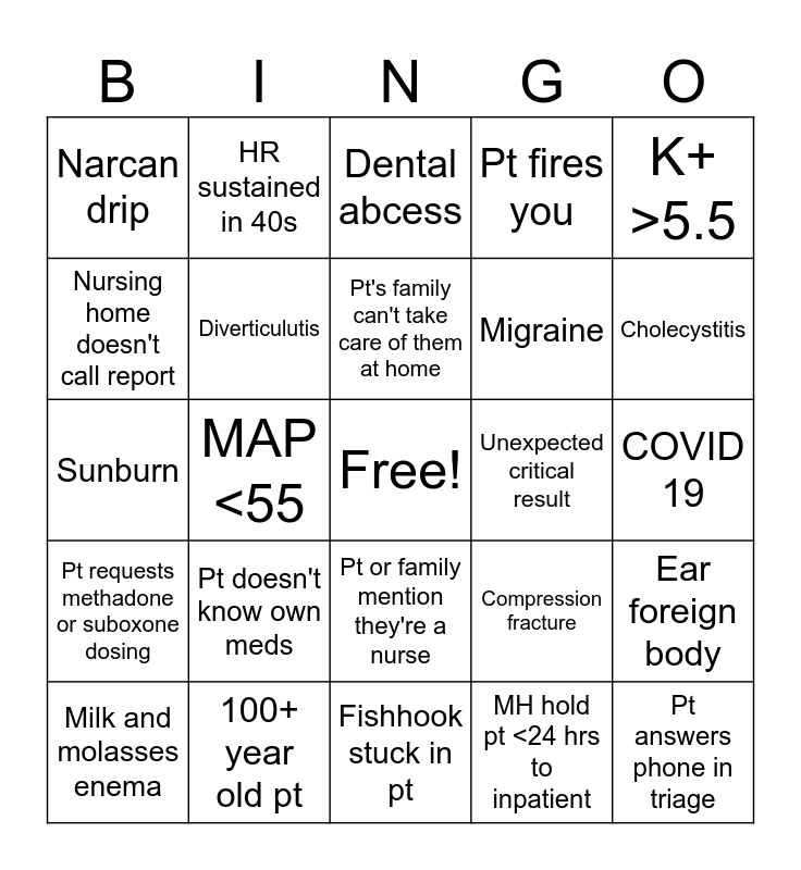 This bingo card has a free space and 24 words: Pt doesn't know own meds, 100+ year old pt, Pt's family can't take care of them at home, Milk and molasses enema, K+ >5.5, Narcan drip, Nursing home doesn't call report, HR sustained in 40s, Unexpected critical result, Pt or family mention they're a nurse, Migraine, Sunburn, Compression fracture, Ear foreign body, Diverticulutis, MH hold pt <24 hrs to inpatient, COVID 19, Dental abcess, Cholecystitis, MAP <55, Pt answers phone in triage, Pt requests methadone or suboxone dosing, Pt fires you and Fishhook stuck in pt.