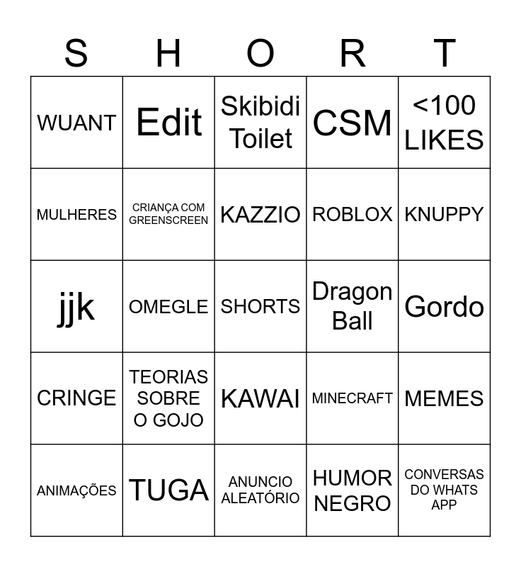 This bingo card has a free space and 24 words: TEORIAS SOBRE O GOJO, TUGA, KAZZIO, ANIMAÇÕES, <100 LIKES, WUANT, MULHERES, Edit, Dragon Ball, KAWAI, ROBLOX, jjk, MINECRAFT, MEMES, CRIANÇA COM GREENSCREEN, HUMOR NEGRO, Gordo, Skibidi Toilet, KNUPPY, OMEGLE, CONVERSAS DO WHATS APP, CRINGE, CSM and ANUNCIO ALEATÓRIO.