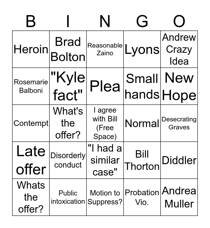 This bingo card has a free space and 55 words: WIW, Whats the offer?, Cyndy angry monologue, Heroin, Motion to Suppress?, Competency, "Kyle fact", Habe, Small hands, "is the worst", Lyons, Greg makes a pun, Brown, Ronald McDonald, Juvenile Court, Aaron Brown's Memory, Andrew Crazy Idea, What's the offer?, Theft, Andrea Muller, Normal, Emery, Bill Thorton, Reasonable Zaino, WIW after trial?, Plea, Probation Vio., Song Lyrics, Desecrating Graves, Diddler, AFSA, DUI, Treatment, Cut the baby in half, Rosemarie Balboni, Contempt, Late To Court, Late offer, Prison, Drug Court, Brad Bolton, Resisting Arrest, HO, Bail appeal, Disorderly conduct, Public intoxication, Bad Michael, John Blanchard, Motion to Continue, New Hope, Lyons, Jelly Bean, Rent Money, "I had a similar case" and MIL.