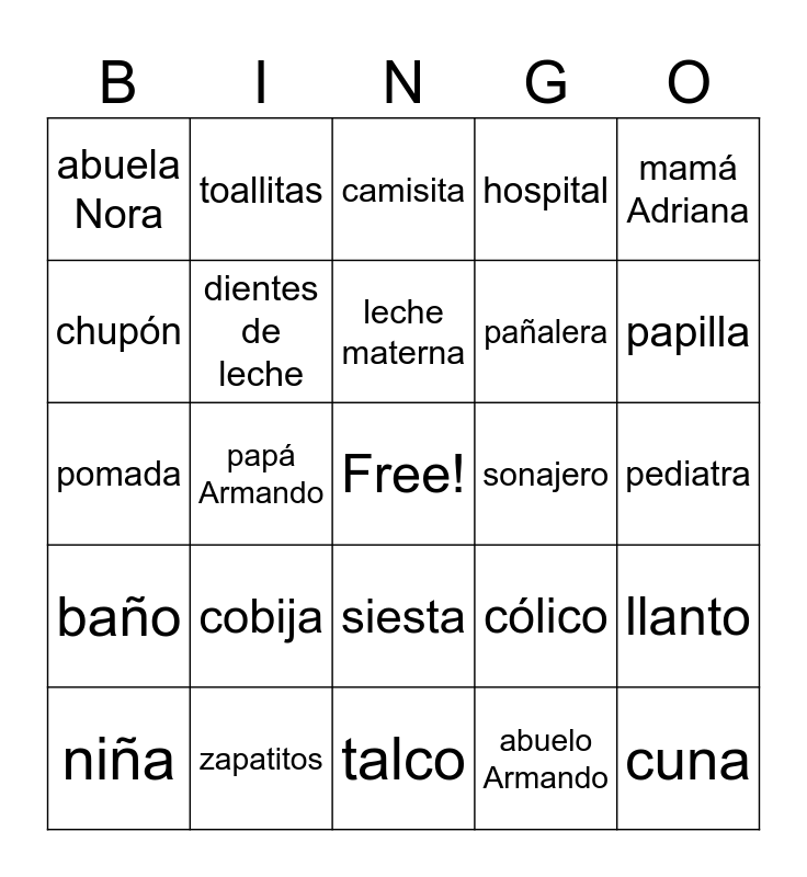 This bingo card has a free space and 49 words: biberon, cuna, carriola, talco, cobija, pañales, toallitas, peluche, chupón, mameluco, dientes de leche, hospital, llanto, cólico, babero, fórmula, leche materna, sonajero, juguete, mamá Adriana, papá Armando, abuelo Armando, abuela Nora, pañalera, mecedora, papilla, niña, niño, siesta, baño, gatear, tapete de juego, shapoo, ultrasonido, zapatitos, gerber, caballito, peine, pediatra, esterilizador, humidificador, vacunas, columpio, aceite de bebé, pomada, camisita, gimnasio para bebé, embarazo and monitor de bebé.