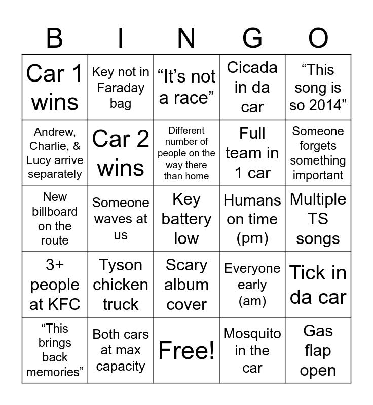 This bingo card has 31 words: Free!, Someone falls asleep, Someone waves at us, Julia passes Emmett on the right, Car 1 wins, “It’s not a race”, Car 2 wins, Everyone early (am), Humans on time (pm), Mosquito in the car, Multiple TS songs, Key battery low, Gas flap open, Swiftie Allegations, Someone forgets something important, Trunk doesn’t close, Tick in da car, Tyson chicken truck, 3+ people at KFC, Scary album cover, “This song is so 2014”, Someone misses their exit, “This brings back memories”, Key not in Faraday bag, Full team in 1 car, Andrew, Charlie, & Lucy arrive separately, Cicada in da car, New billboard on the route, Both cars at max capacity, Different number of people on the way there than home and Fences back up on campus.