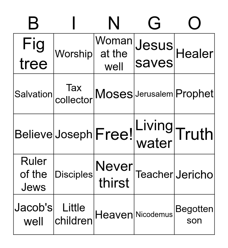This bingo card has a free space and 24 words: Disciples, Little children, Moses, Jacob's well, Healer, Fig tree, Salvation, Worship, Living water, Never thirst, Jerusalem, Believe, Teacher, Jericho, Tax collector, Nicodemus, Truth, Woman at the well, Prophet, Joseph, Begotten son, Ruler of the Jews, Jesus saves and Heaven.
