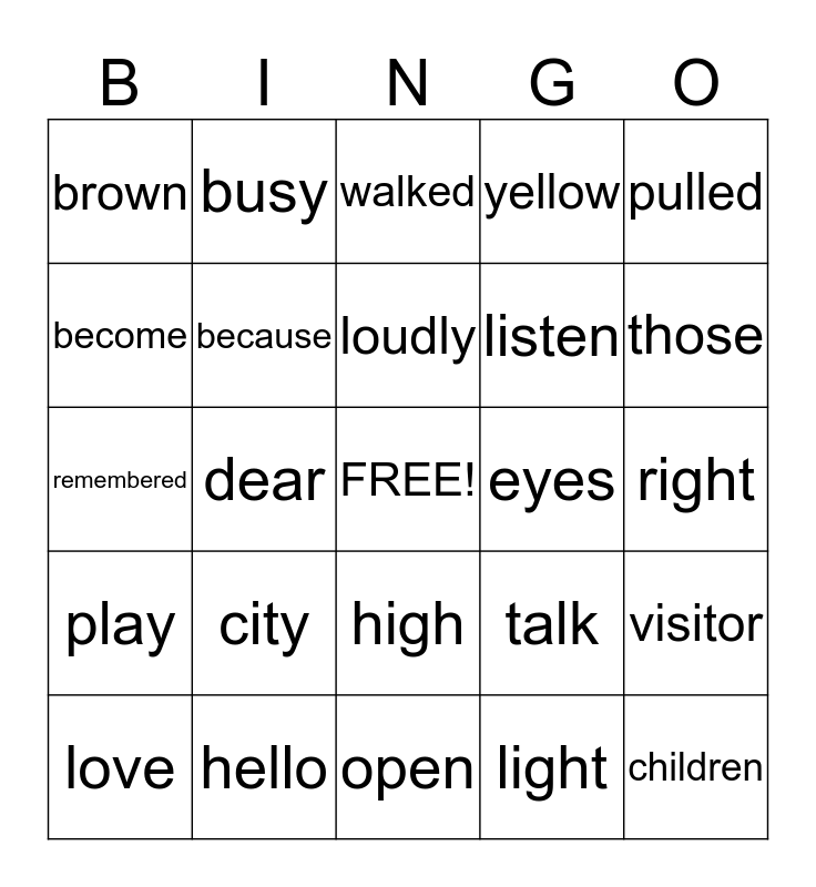 This bingo card has a free space and 24 words: city, hello, loudly, love, pulled, brown, become, busy, eyes, high, listen, remembered, talk, visitor, because, light, right, walked, those, dear, children, play, yellow and open.