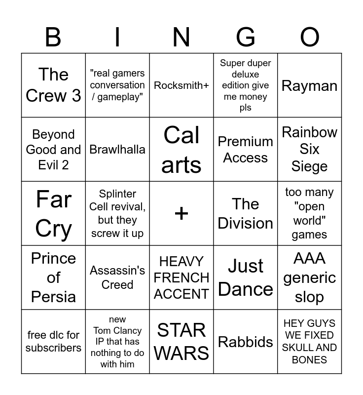 This bingo card has a free space and 24 words: Assassin's Creed, new Tom Clancy IP that has nothing to do with him, Cal arts, free dlc for subscribers, Rayman, The Crew 3, Beyond Good and Evil 2, "real gamers conversation / gameplay", The Division, HEAVY FRENCH ACCENT, Premium Access, Far Cry, Just Dance, AAA generic slop, Brawlhalla, Rabbids, too many "open world" games, Rocksmith+, Rainbow Six Siege, Splinter Cell revival, but they screw it up, HEY GUYS WE FIXED SKULL AND BONES, Prince of Persia, Super duper deluxe edition give me money pls and STAR WARS.