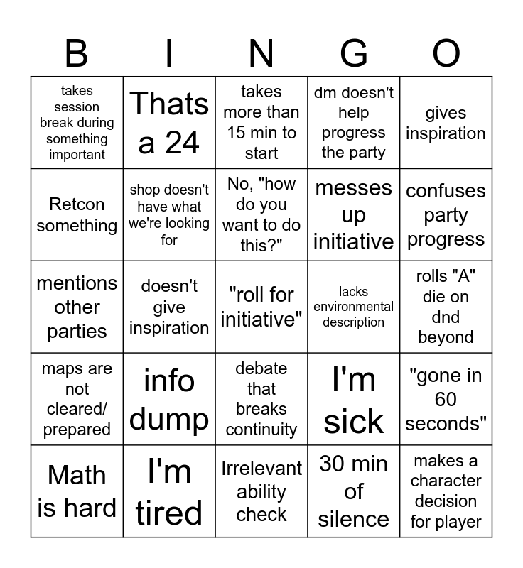 This bingo card has a free space and 24 words: Math is hard, info dump, No, "how do you want to do this?", 30 min of silence, gives inspiration, takes session break during something important, Thats a 24, takes more than 15 min to start, lacks environmental description, rolls "A" die on dnd beyond, mentions other parties, shop doesn't have what we're looking for, I'm sick, "gone in 60 seconds", Retcon something, I'm tired, Irrelevant ability check, dm doesn't help progress the party, confuses party progress, maps are not cleared/ prepared, doesn't give inspiration, debate that breaks continuity, messes up initiative and makes a character decision for player.