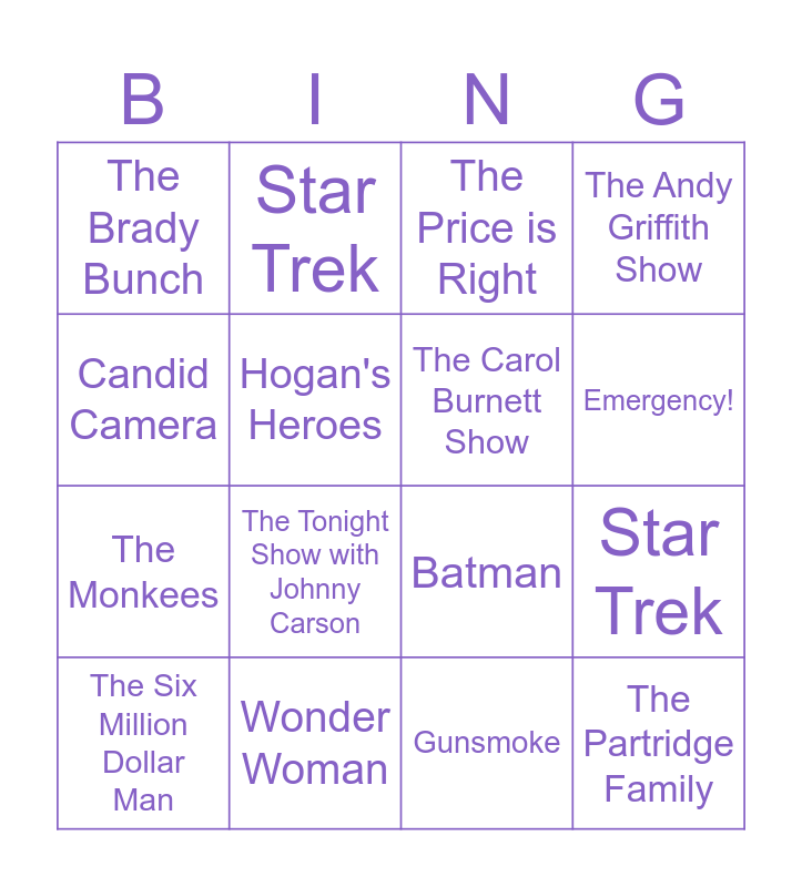 This bingo card has 27 words: Free!, Bewitched, The Monkees, The Waltons, Hogan's Heroes, The Price is Right, Star Trek, The Partridge Family, Wonder Woman, Adam-12, Batman, The Andy Griffith Show, Hong Kong Phooey, Happy Days, The Tonight Show with Johnny Carson, The Addams Family, The Carol Burnett Show, Emergency!, M*A*S*H, The Brady Bunch, Gunsmoke, Scooby Doo Where Are You?, Star Trek, The Six Million Dollar Man, Sesame Street, Candid Camera and Hawaii Five-O.