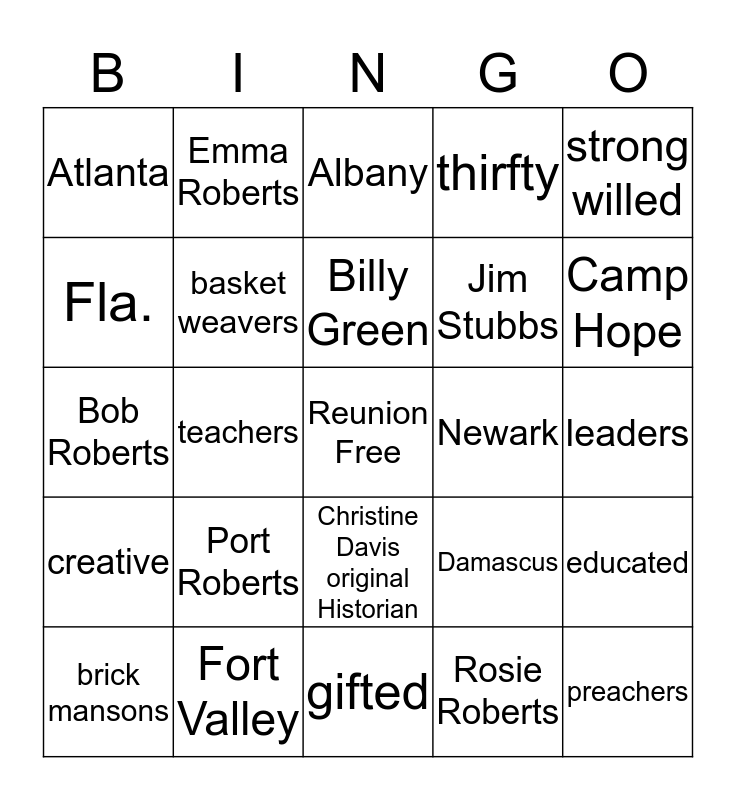 This bingo card has a free space and 24 words: Port Roberts, Fort Valley, Billy Green, brick mansons, strong willed, Atlanta, Fla., Emma Roberts, Newark, Christine Davis original Historian, Jim Stubbs, Bob Roberts, Damascus, educated, basket weavers, Rosie Roberts, leaders, Albany, Camp Hope, teachers, preachers, creative, thirfty and gifted.