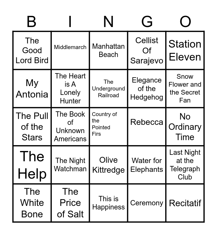 This bingo card has 50 words: Song of Solomon, Country of the Pointed Firs, Where the Crawdads Sing, This is Happiness, The Night Watchman, Anna Karenina, Middlemarch, The Red Azalea, My Antonia, Prodigal Summer, The Heart is A Lonely Hunter, Cellist Of Sarajevo, Last Night at the Telegraph Club, Water for Elephants, All the Light We Cannot See, My Brilliant Friend, The Underground Railroad, Rebecca, The Wren, The Wren, Station Eleven, The Book of Unknown Americans, Ceremony, The Good Lord Bird, Elegance of the Hedgehog, The Immortal Life of Henrietta Lacks, Recitatif, Snow Flower and the Secret Fan, The Sympathizer, Manhattan Beach, Olive Kittredge, A Tree Grows in Brooklyn, West with Giraffes, Drive Your Plow Over the Bones of the Dead, Go, Went, Gone, The Price of Salt, Kristin Lavransdatter, Having Our Say by the Delaney Sisters, There, There, Song of the Lark, No Ordinary Time, A Woman of No Importance, The Overstory, Narrative of Sojourner Truth, Wolf Winter, The White Bone, The Pull of the Stars, Ahab's Wife, Gilead, The Help and Tinkers.