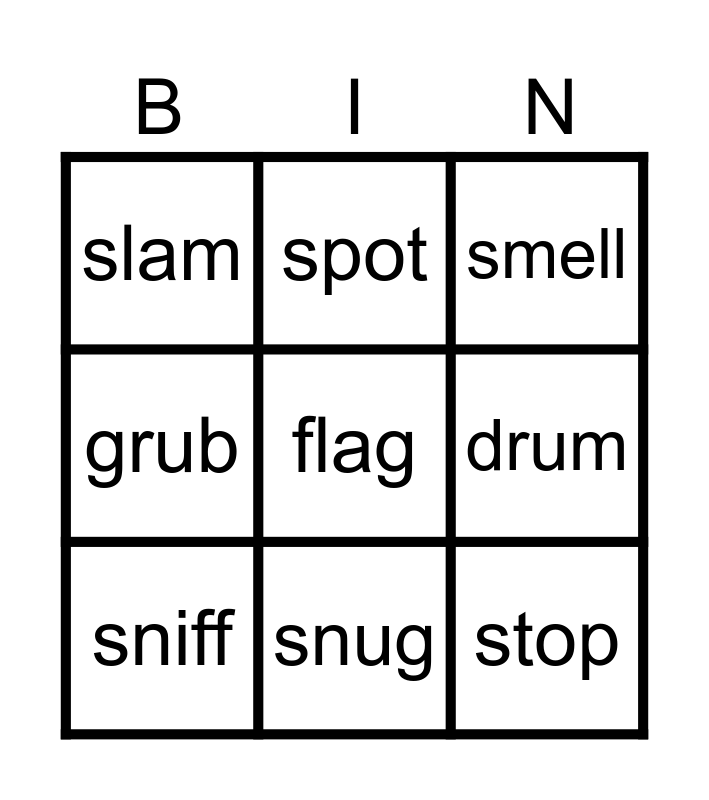 This bingo card has 30 words: crab, grab, gruff, plan, slam, smell, sniff, trap, step, clip, grin, skip, slip, swill, swim, trip, twin, drop, dress, flag, frog, flop, spot, stop, drum, grub, plum, slug, snug and snuff.