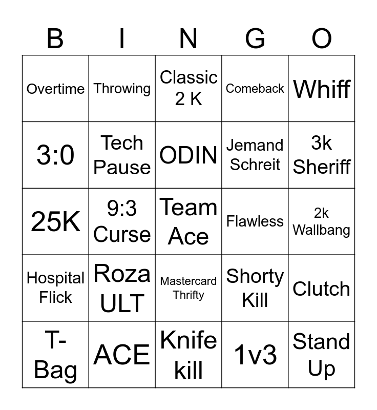 This bingo card has a free space and 24 words: Roza ULT, ACE, ODIN, T- Bag, Whiff, Overtime, 3:0, Throwing, Flawless, Mastercard Thrifty, Jemand Schreit, 25K, Shorty Kill, Clutch, Tech Pause, 1v3, 2k Wallbang, Classic 2 K, 3k Sheriff, 9:3 Curse, Stand Up, Hospital Flick, Comeback and Knife kill.