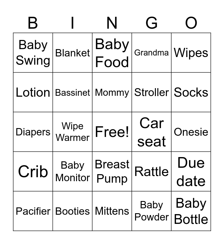 This bingo card has a free space and 29 words: Pacifier, Rubber Duck, Wipe Warmer, Diaper Cream, Baby Swing, Baby Food, Bassinet, Baby Monitor, Car seat, Booties, Onesie, Baby Bottle, Mittens, Baby Powder, Socks, Formula, Breast Pump, Crib, Wipes, Diapers, Rattle, Diaper Bag, Stroller, Lotion, Grandma, Blanket, Due date, Mommy and Daddy.