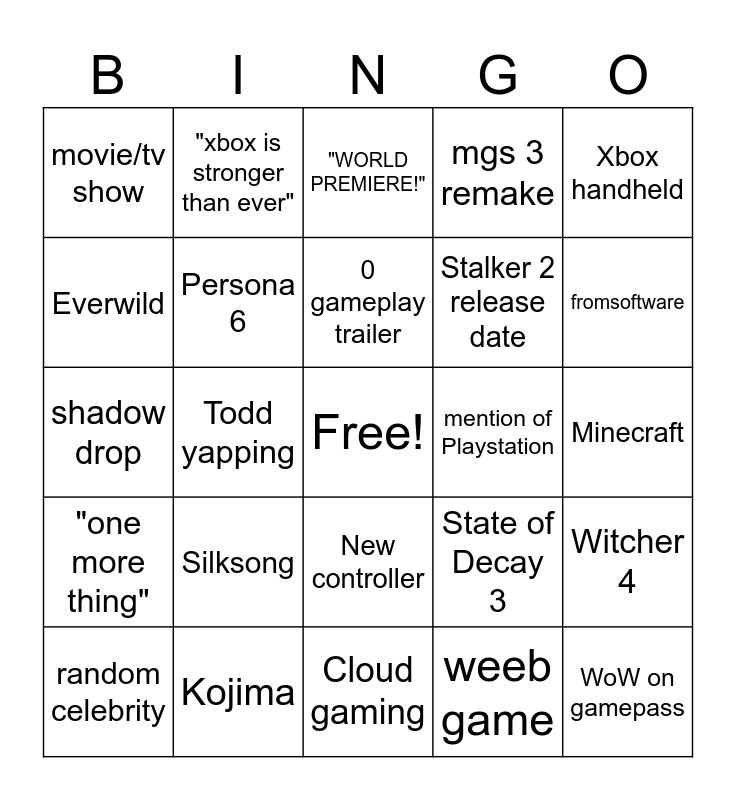 This bingo card has a free space and 24 words: Silksong, Kojima, 0 gameplay trailer, random celebrity, Xbox handheld, movie/tv show, Everwild, "xbox is stronger than ever", mention of Playstation, New controller, Stalker 2 release date, shadow drop, State of Decay 3, Witcher 4, Persona 6, weeb game, Minecraft, "WORLD PREMIERE!", fromsoftware, Todd yapping, WoW on gamepass, "one more thing", mgs 3 remake and Cloud gaming.